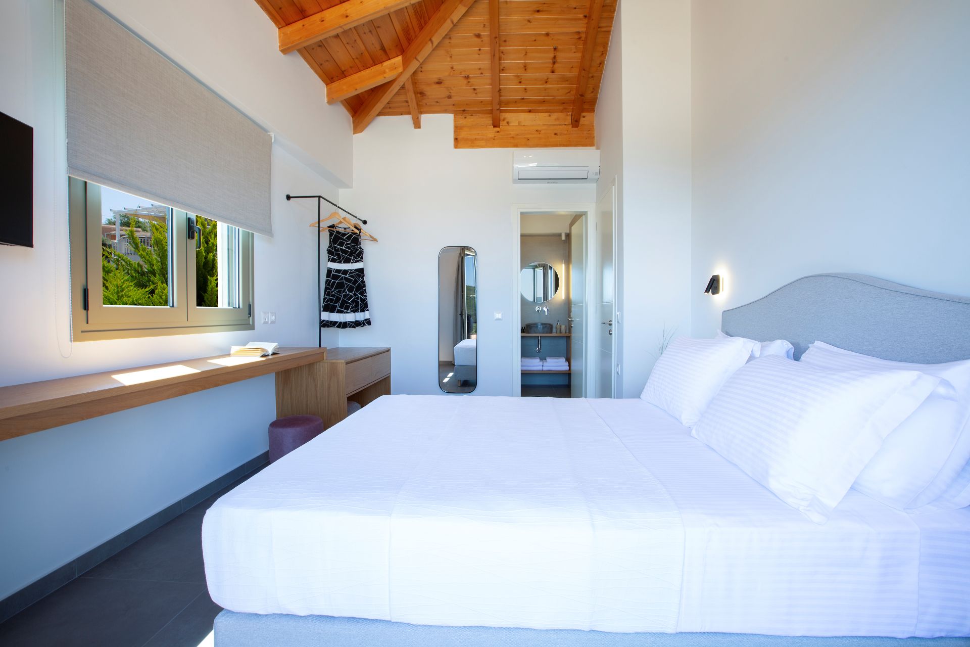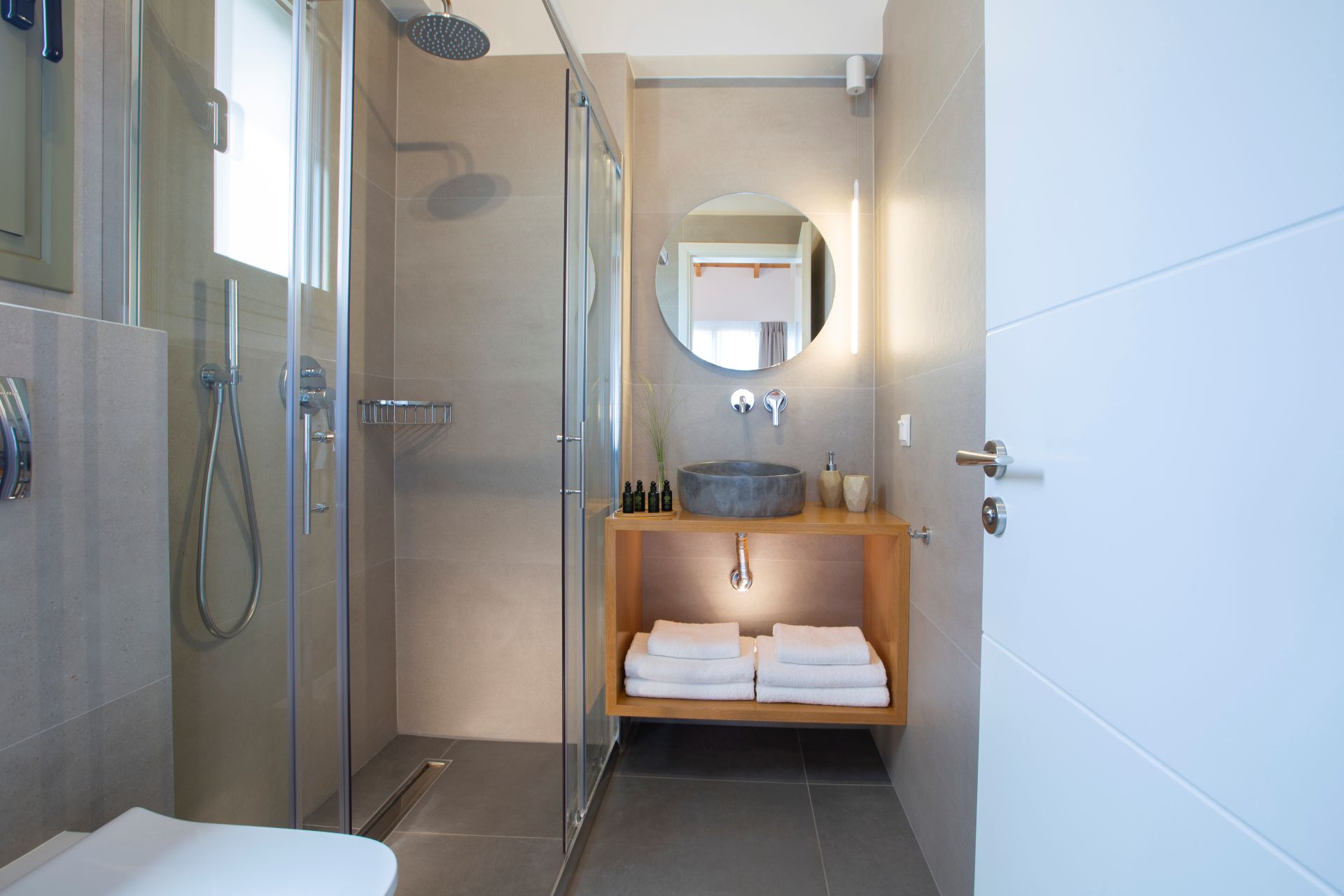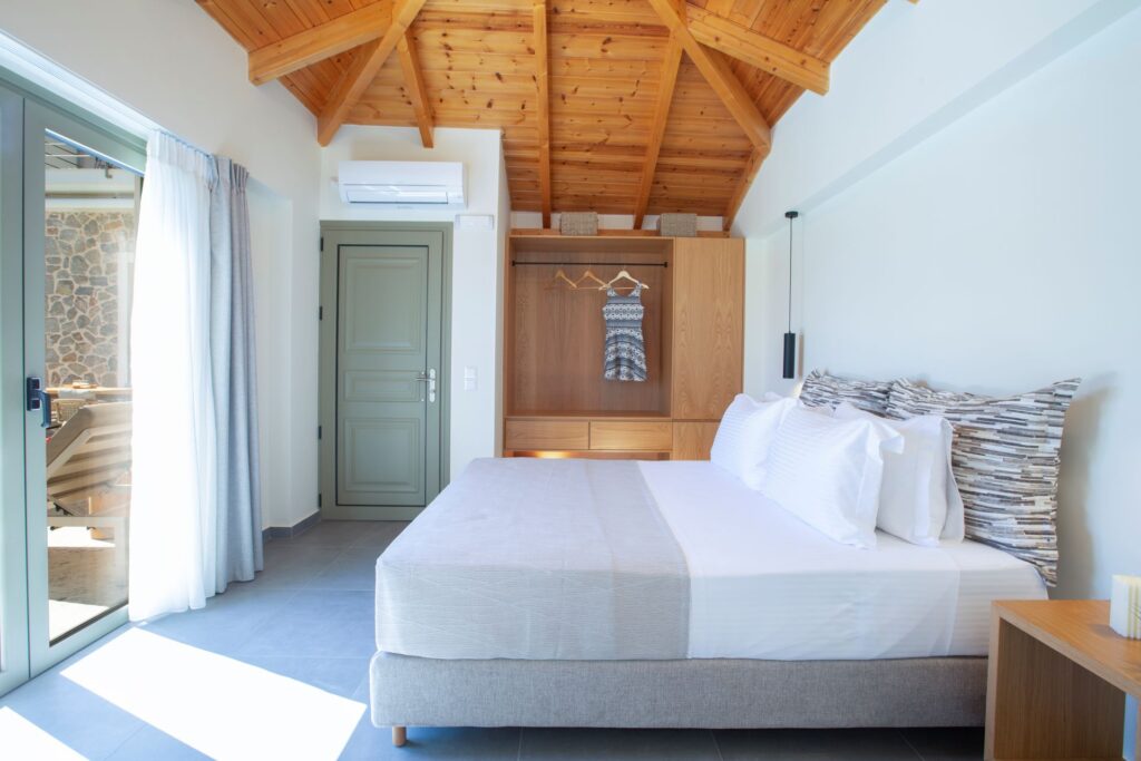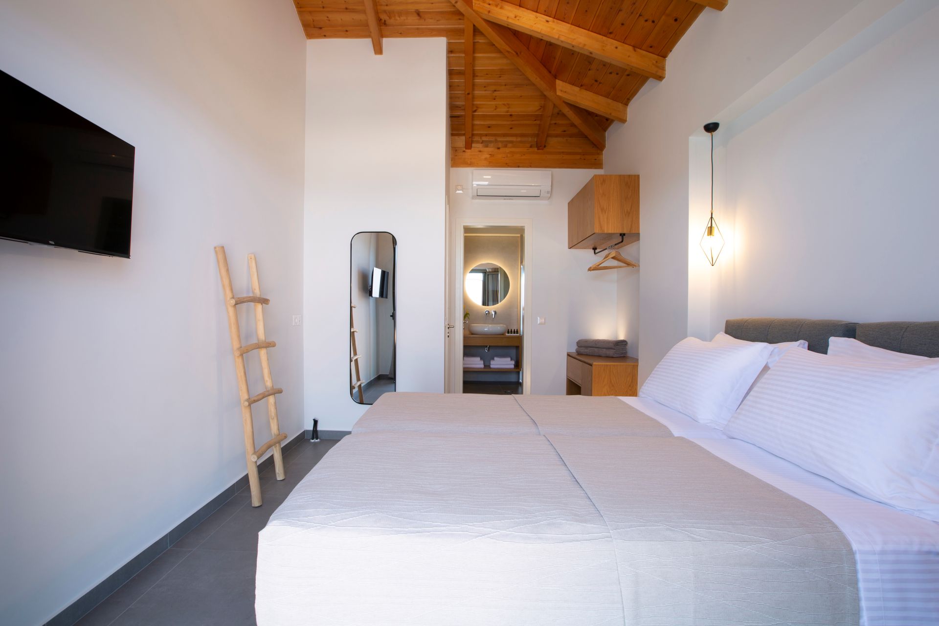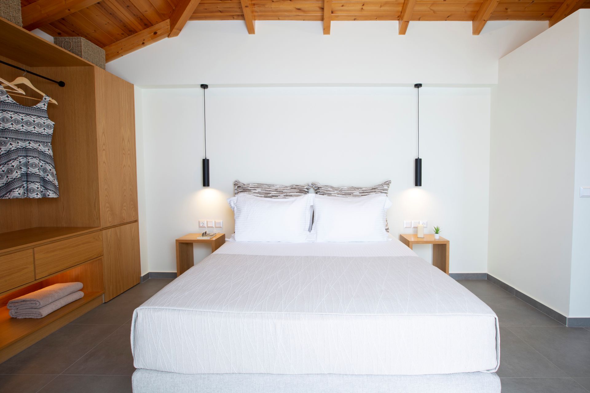 On the first building which is two floors there are 2 bedrooms a living room and a kitchen. On the first floor are 2 master bedrooms with en suite bathrooms with showers. The first bedroom has a double bed (160×200) a balcony with sea view, TV and A/C. The second bedroom has 2 single beds(90×200) that also can be combined to a big double bed (180×200) with a balcony with sea view and TV and A/C.