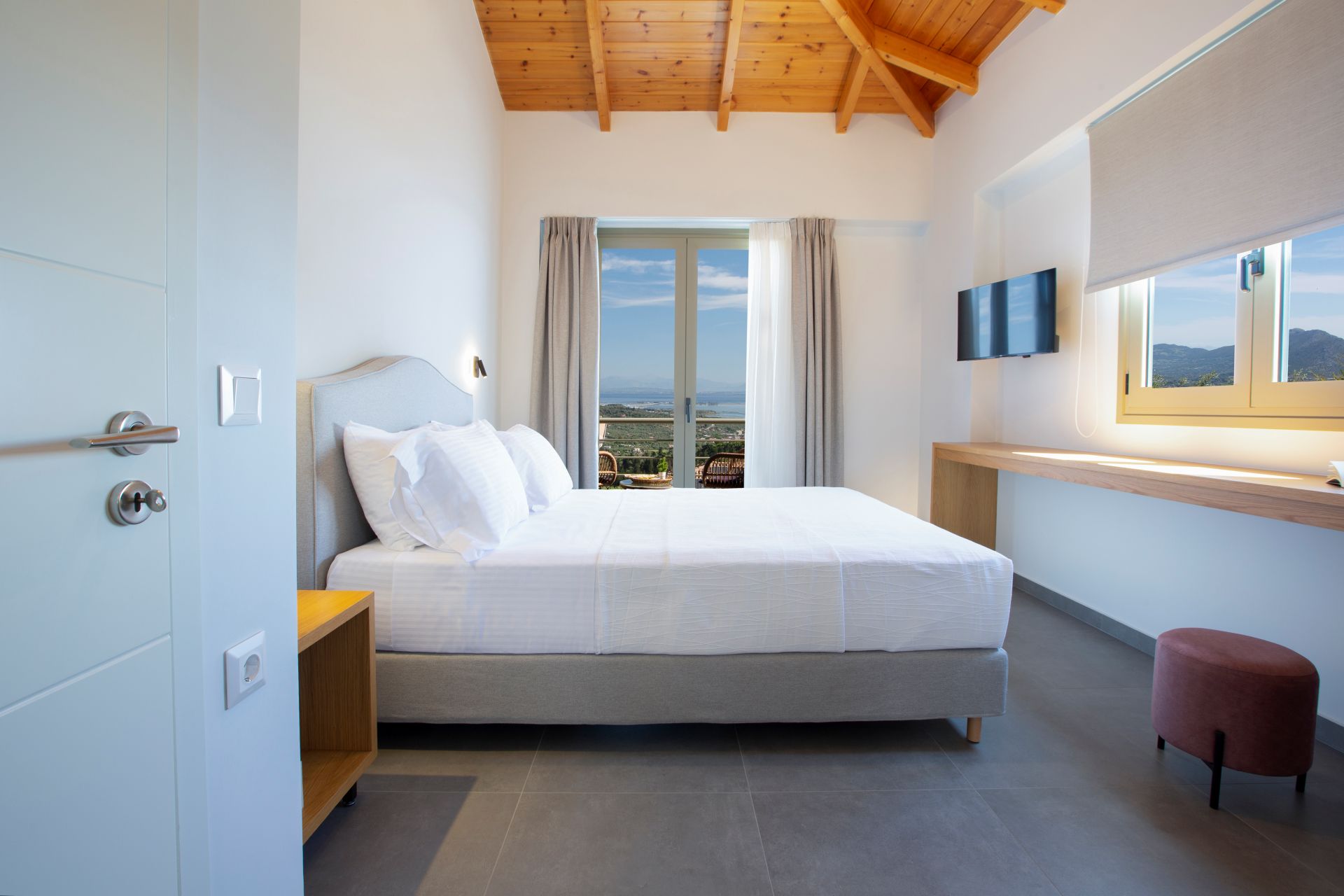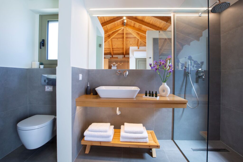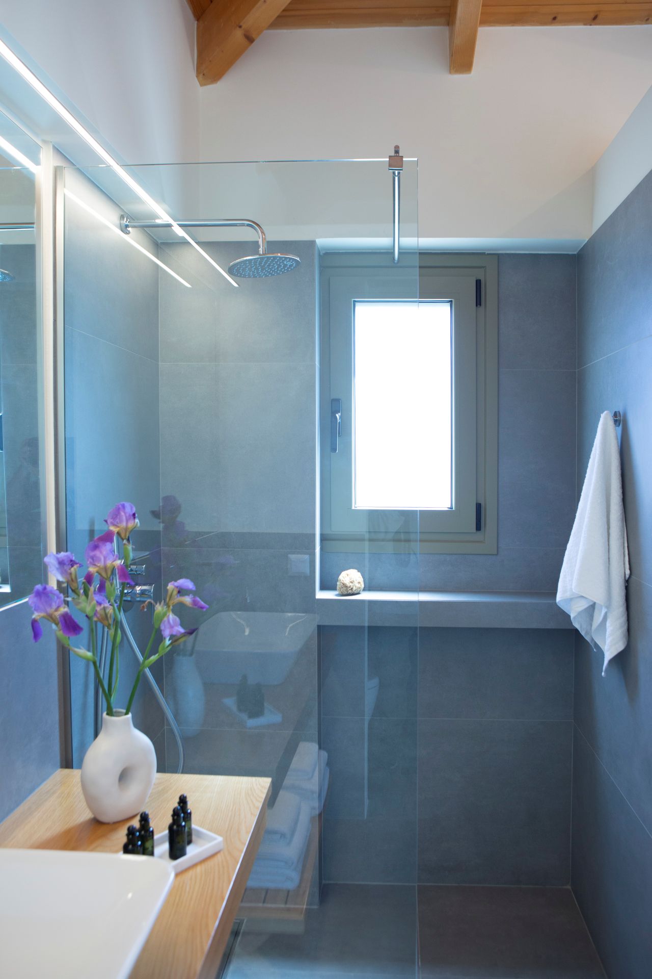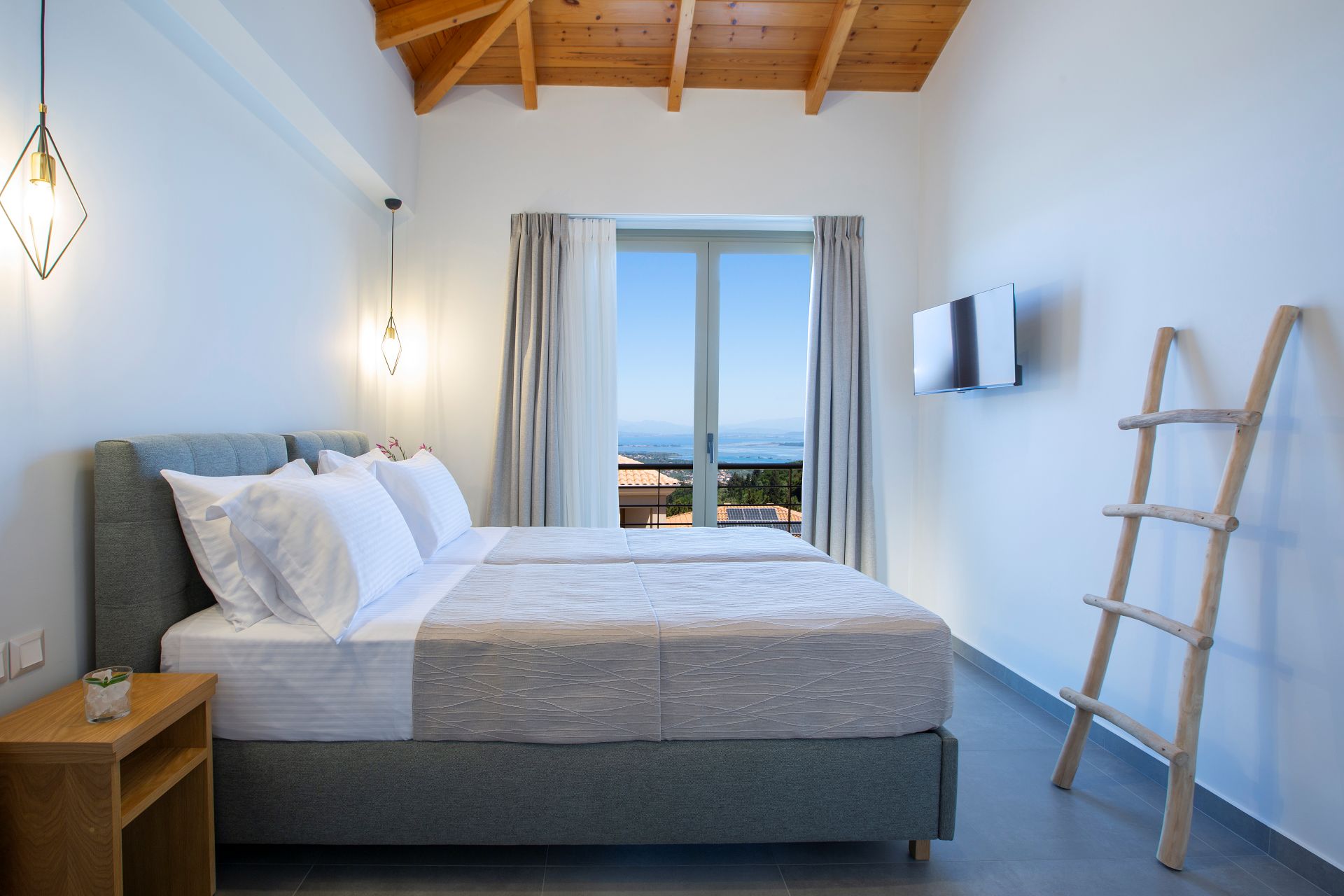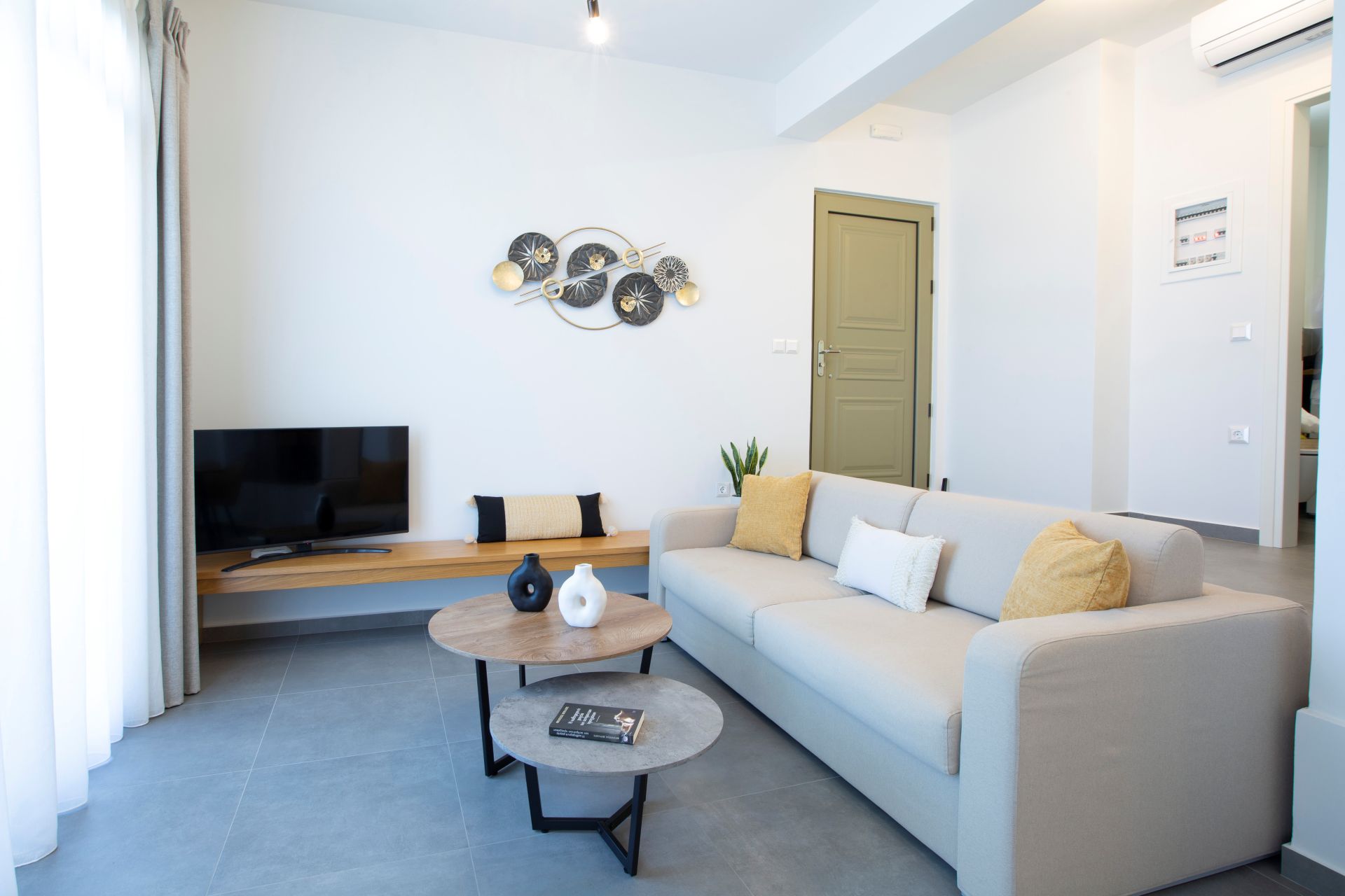 On the first building which is two floors there are 2 bedrooms a living room and a kitchen. On the first floor are 2 master bedrooms with en suite bathrooms with showers. The first bedroom has a double bed (160×200) a balcony with sea view, TV and A/C. The second bedroom has 2 single beds(90×200) that also can be combined to a big double bed (180×200) with a balcony with sea view and TV and A/C.