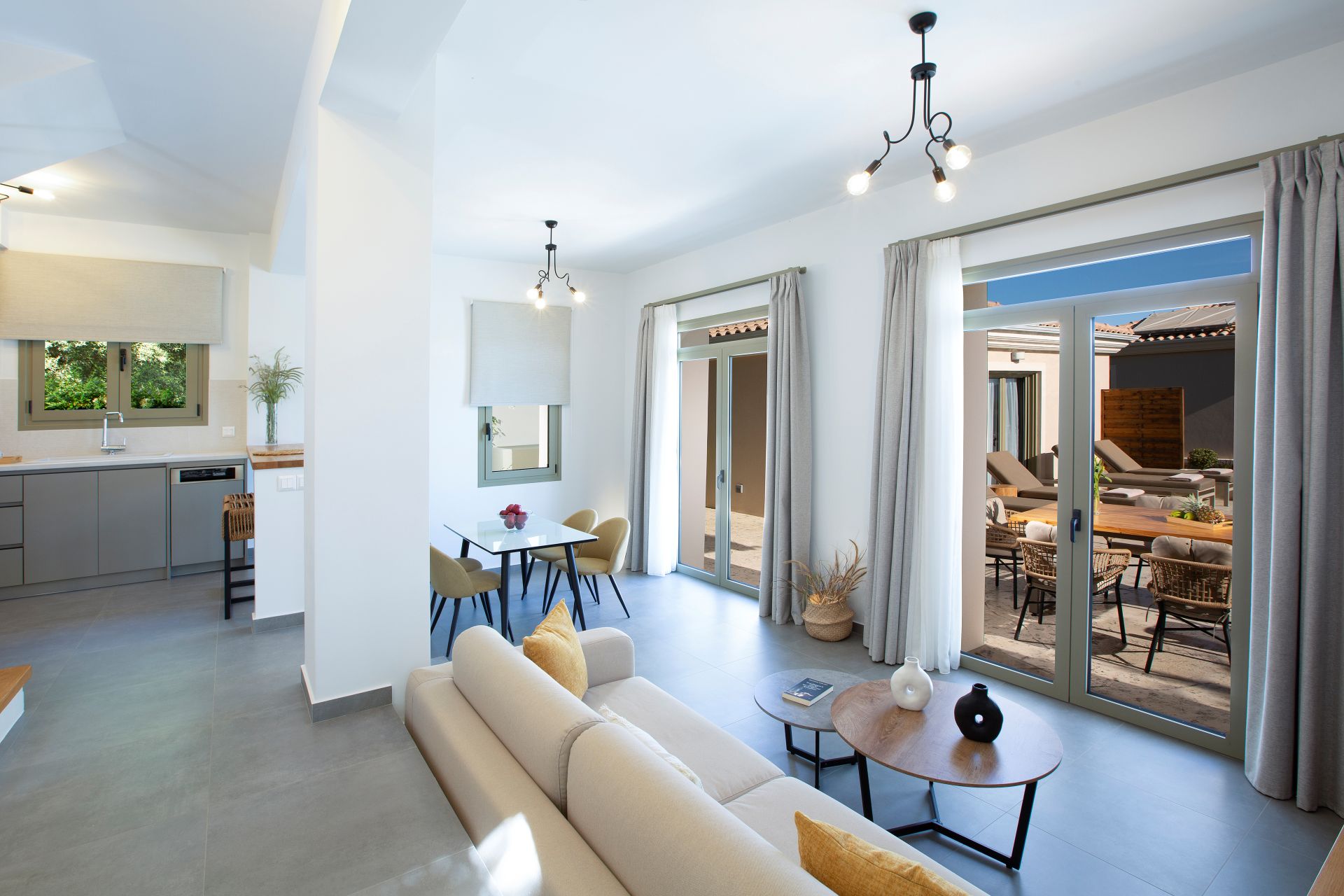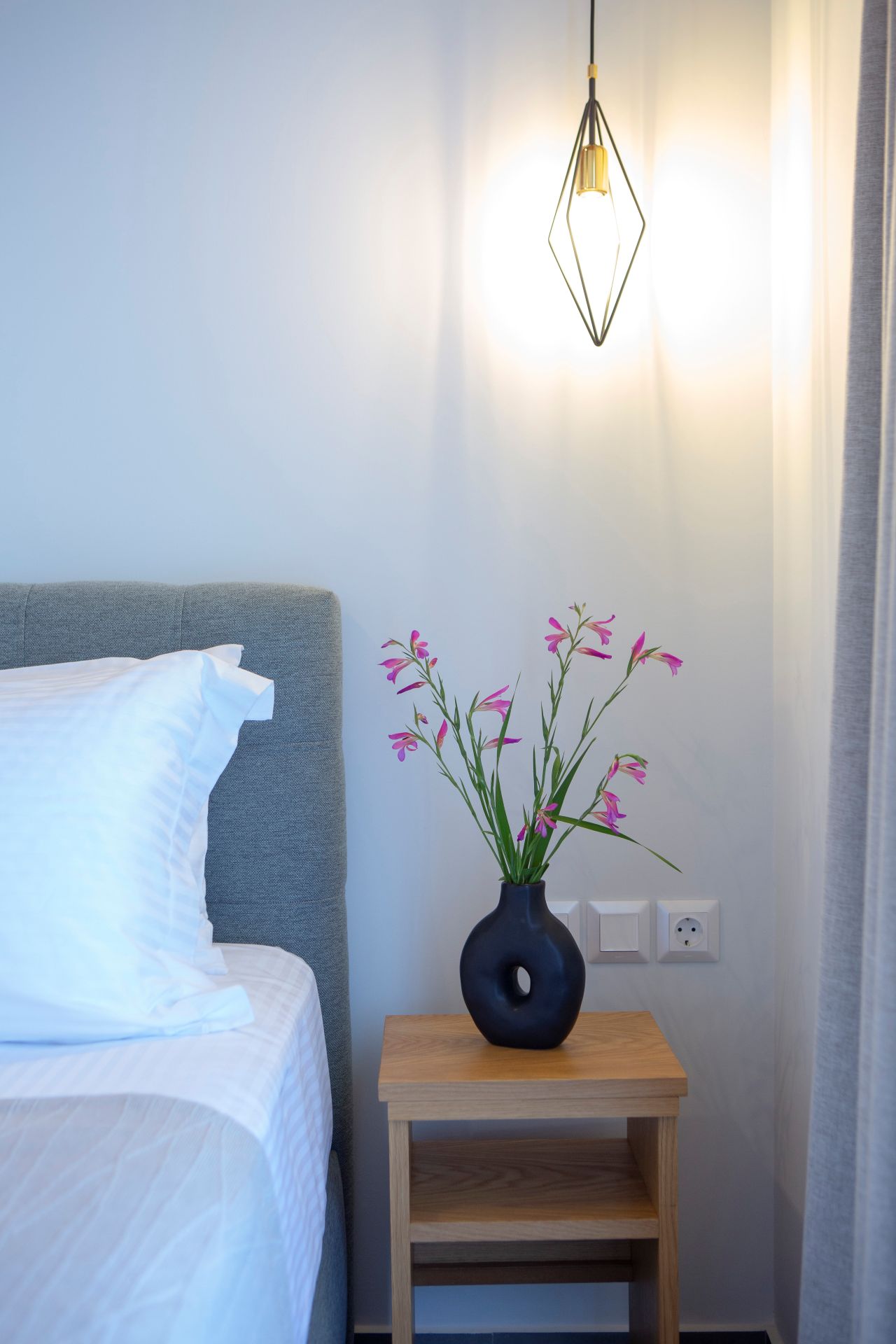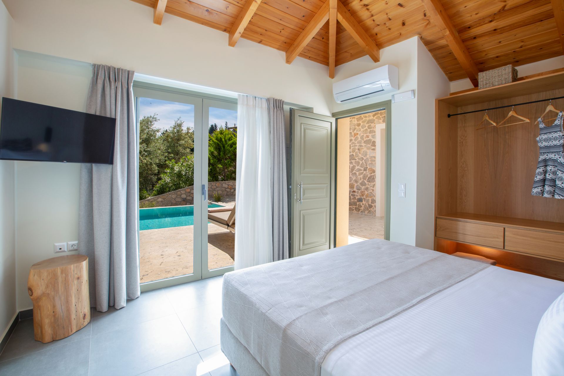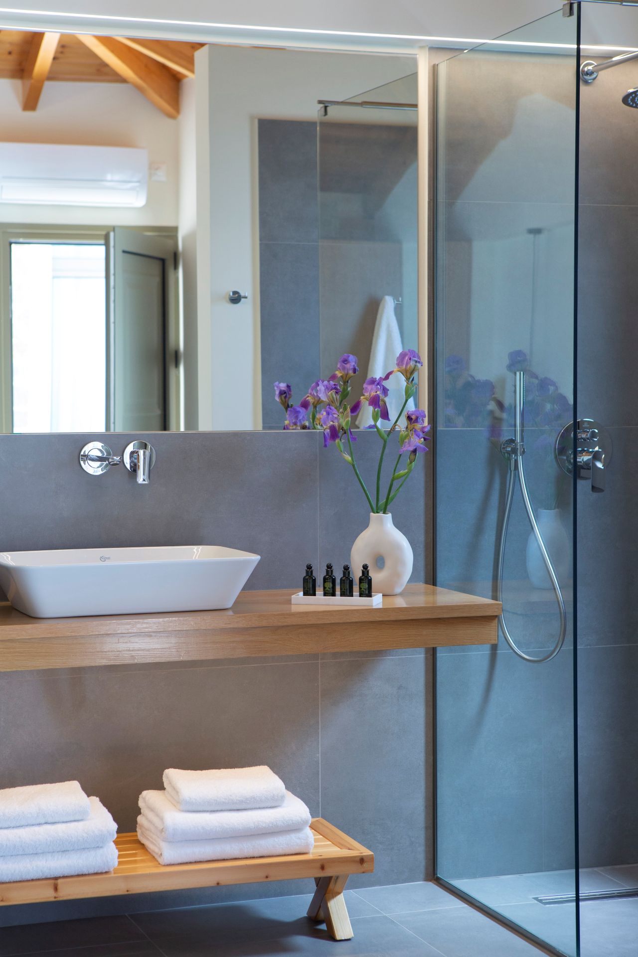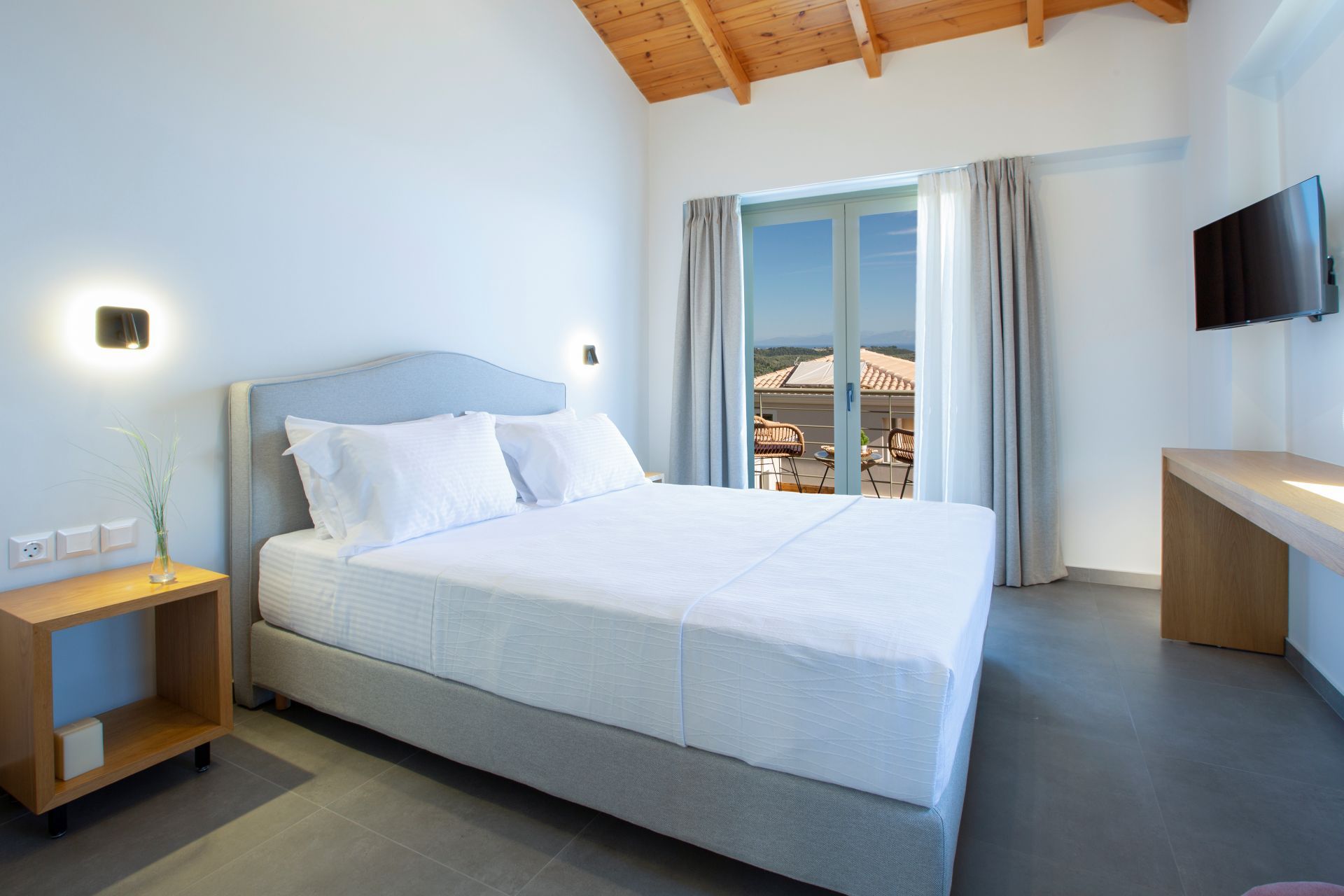 On the first building which is two floors there are 2 bedrooms a living room and a kitchen. On the first floor are 2 master bedrooms with en suite bathrooms with showers. The first bedroom has a double bed (160×200) a balcony with sea view, TV and A/C. The second bedroom has 2 single beds(90×200) that also can be combined to a big double bed (180×200) with a balcony with sea view and TV and A/C.