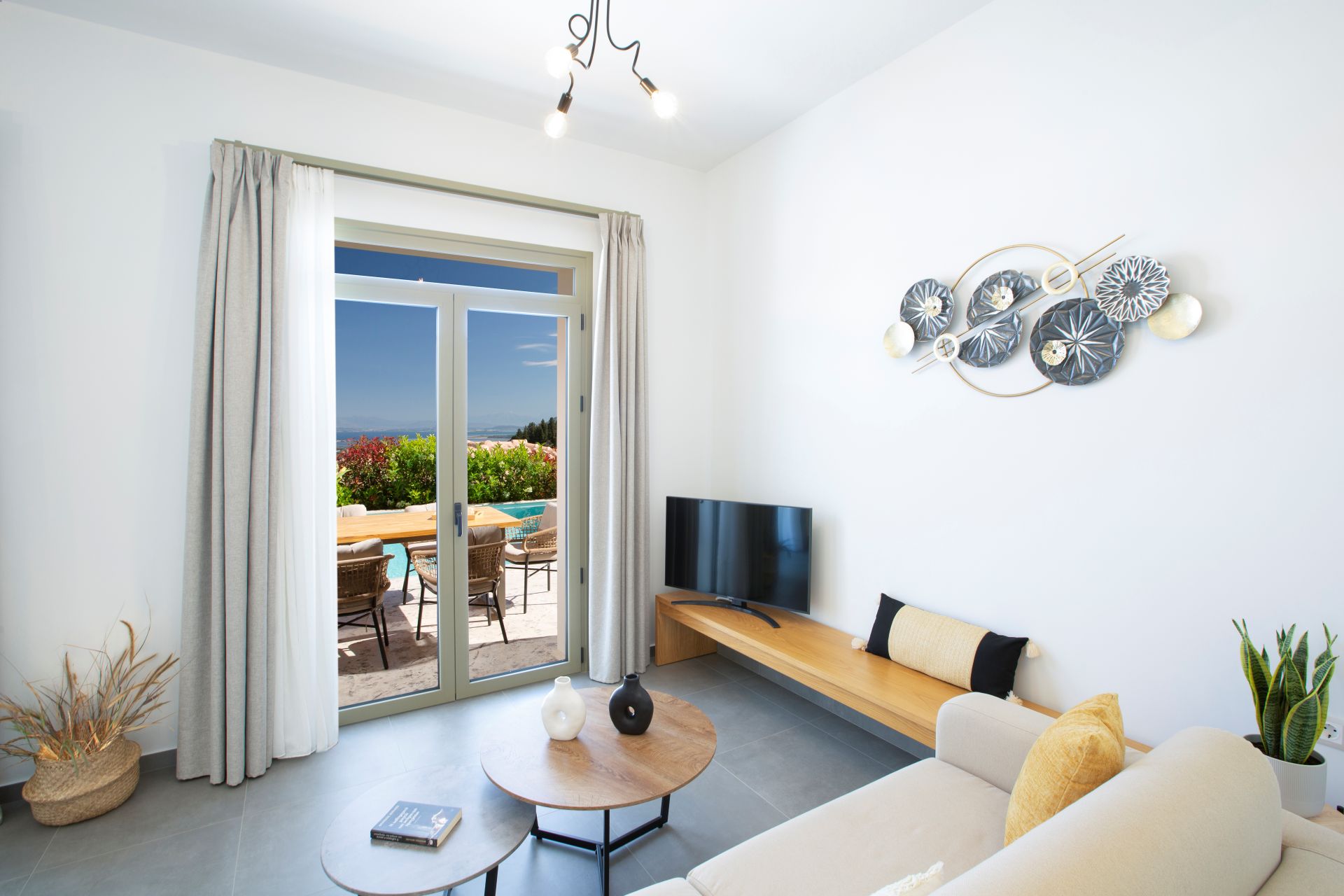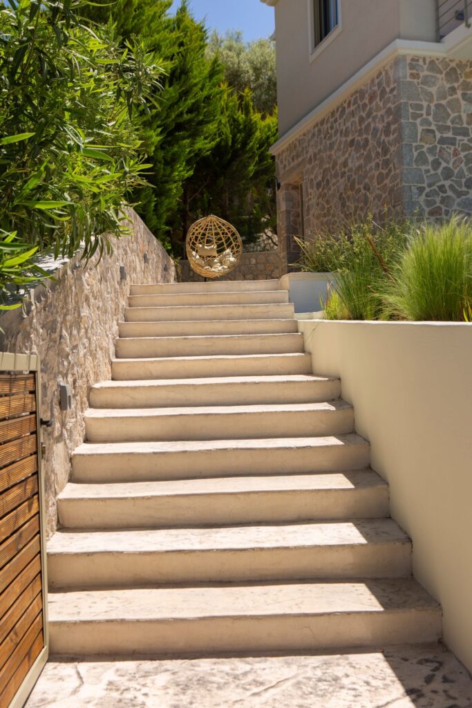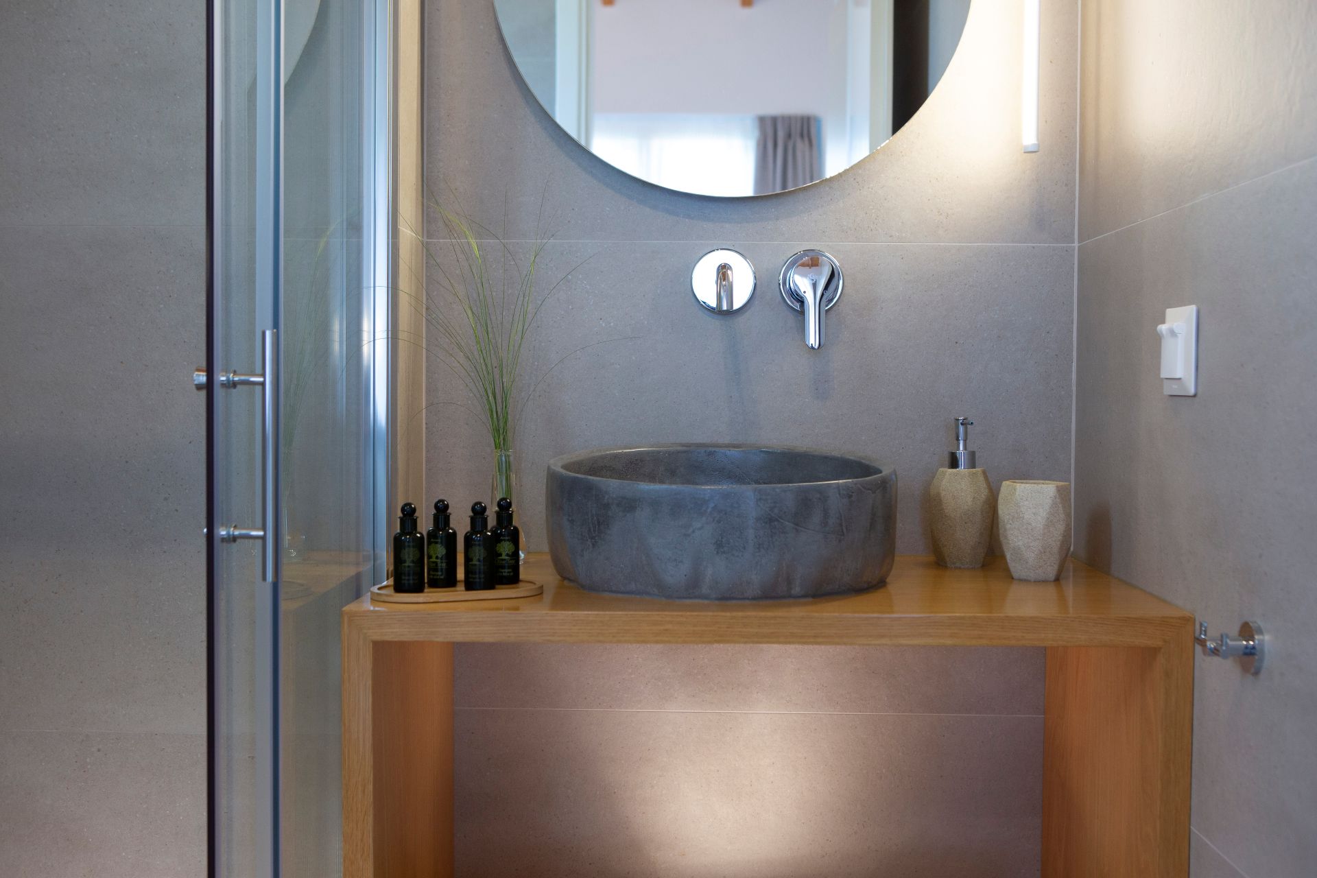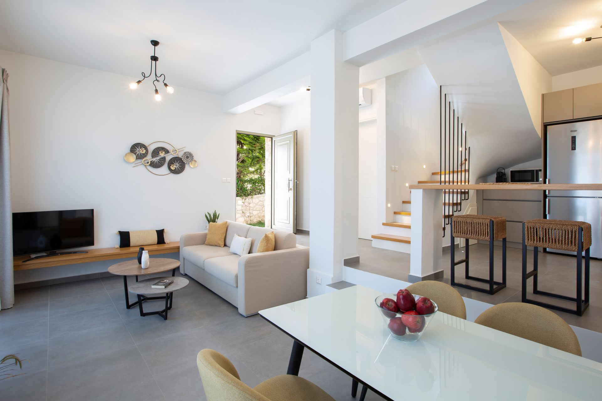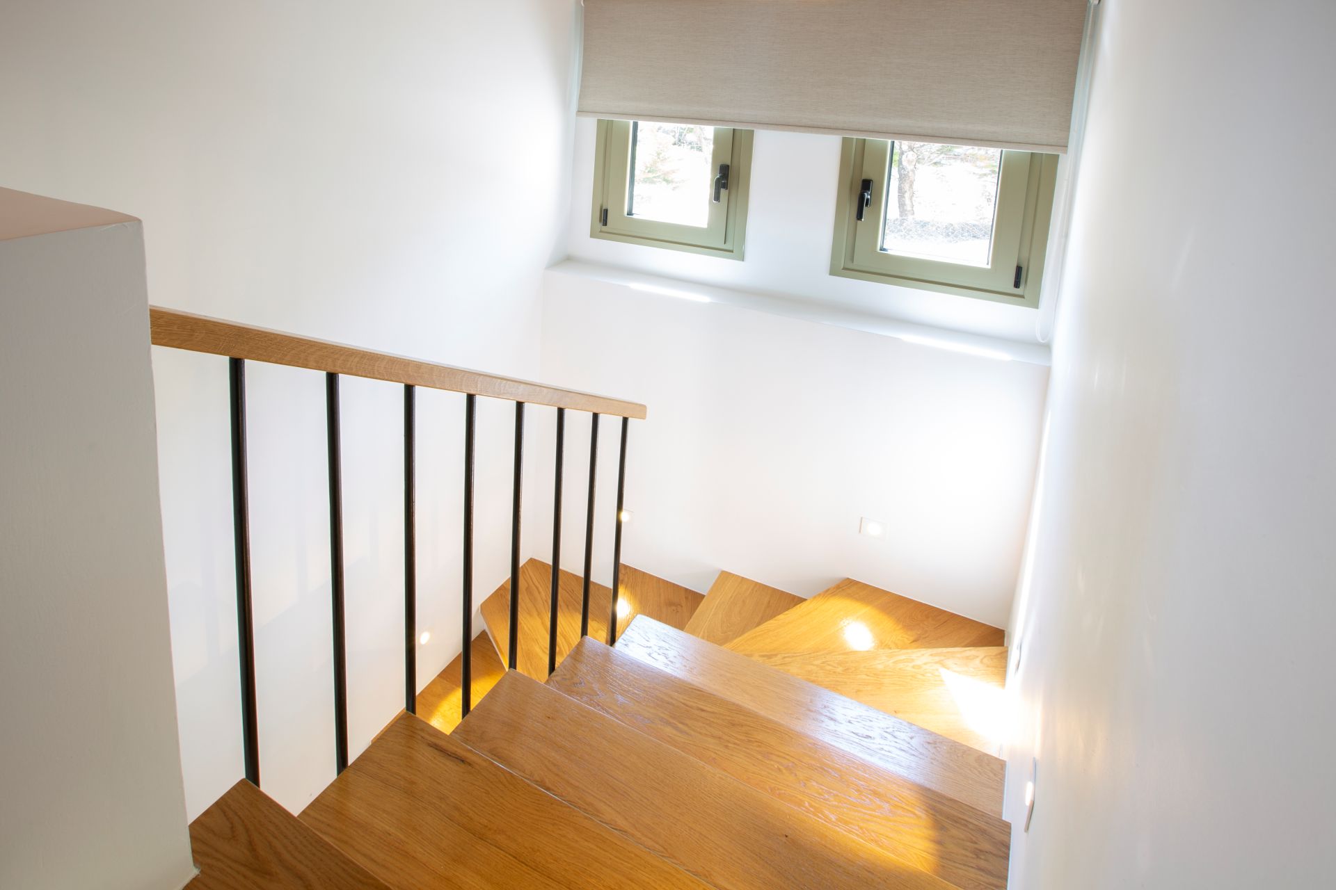 On the first building which is two floors there are 2 bedrooms a living room and a kitchen. On the first floor are 2 master bedrooms with en suite bathrooms with showers. The first bedroom has a double bed (160×200) a balcony with sea view, TV and A/C. The second bedroom has 2 single beds(90×200) that also can be combined to a big double bed (180×200) with a balcony with sea view and TV and A/C.