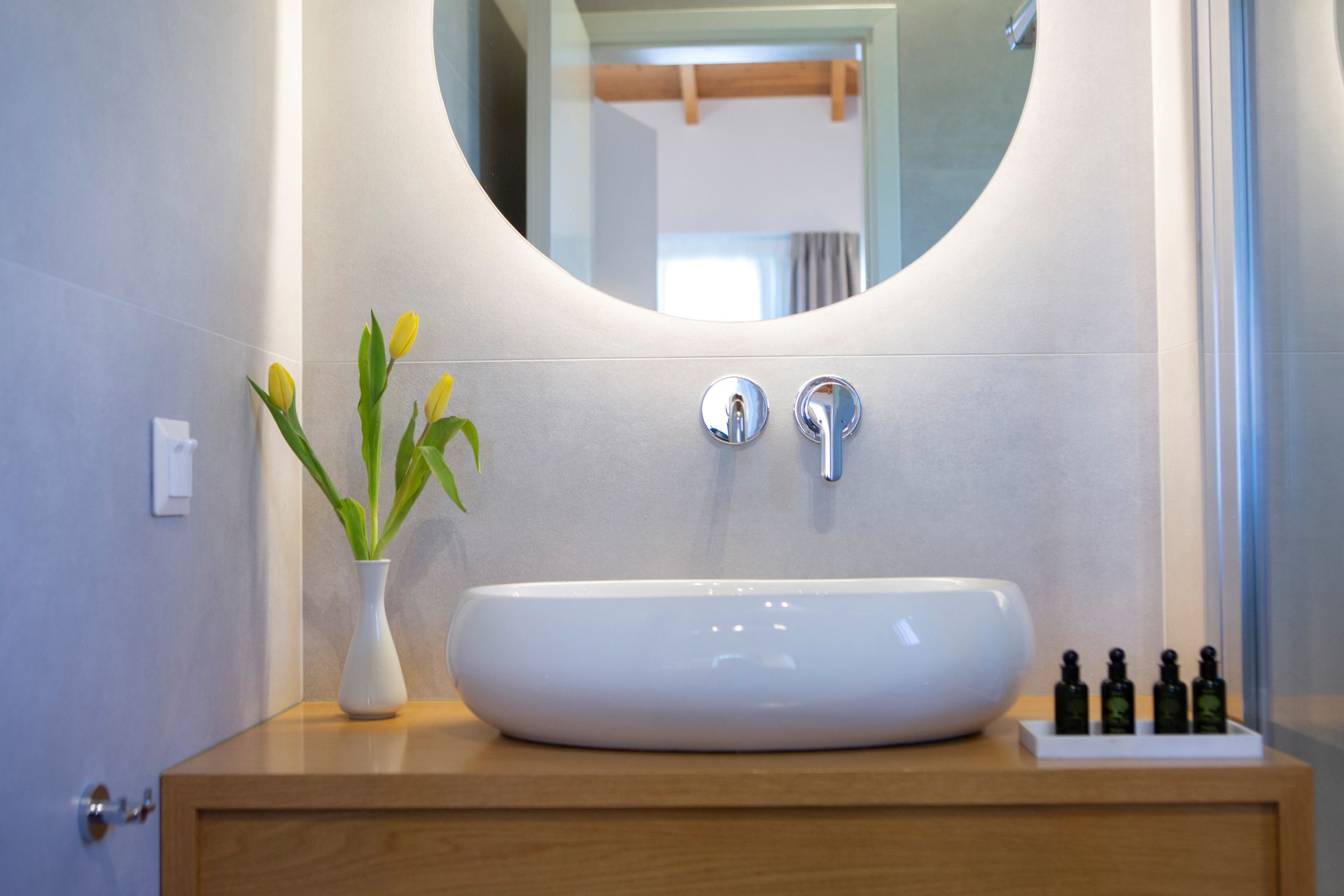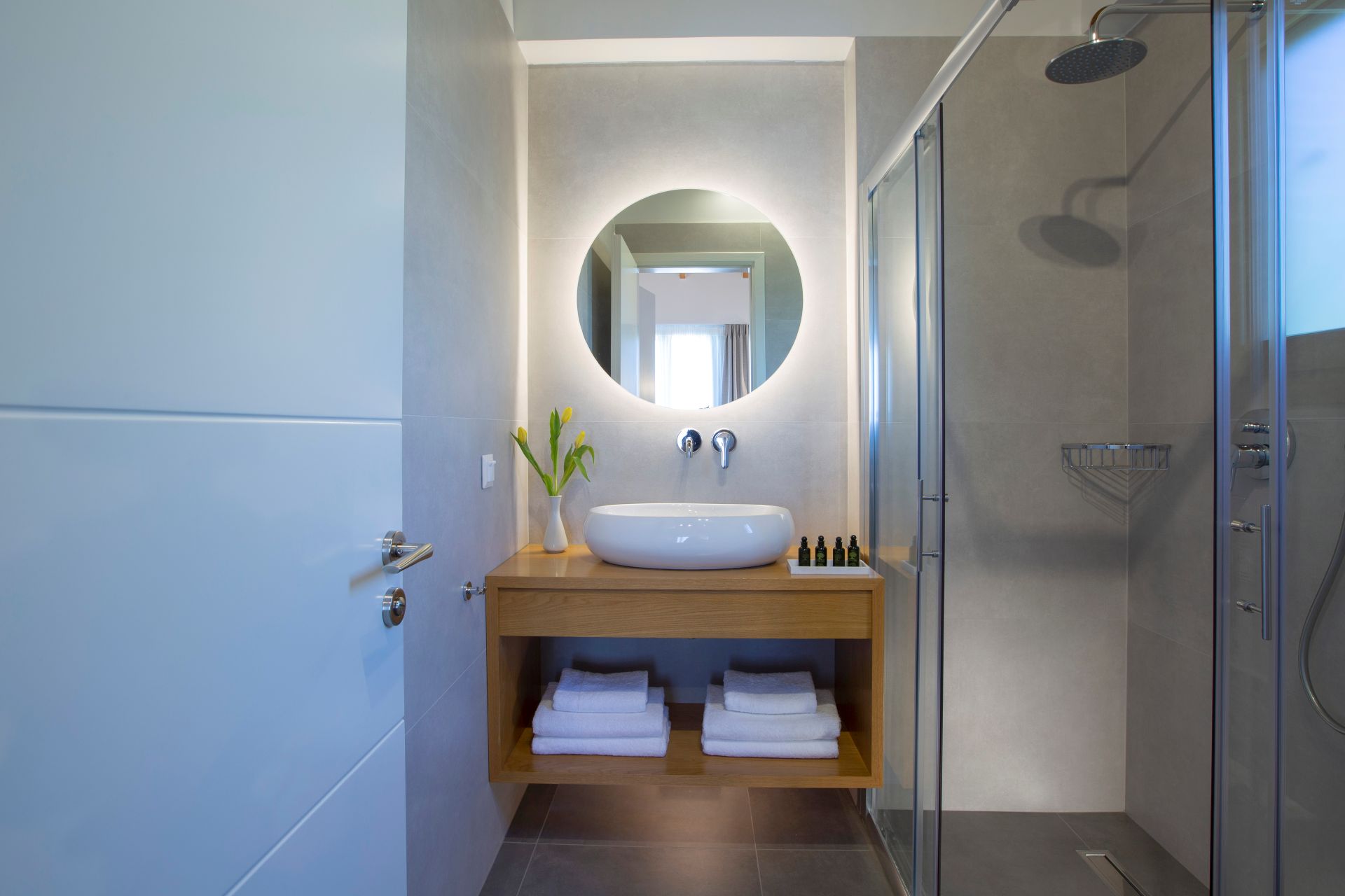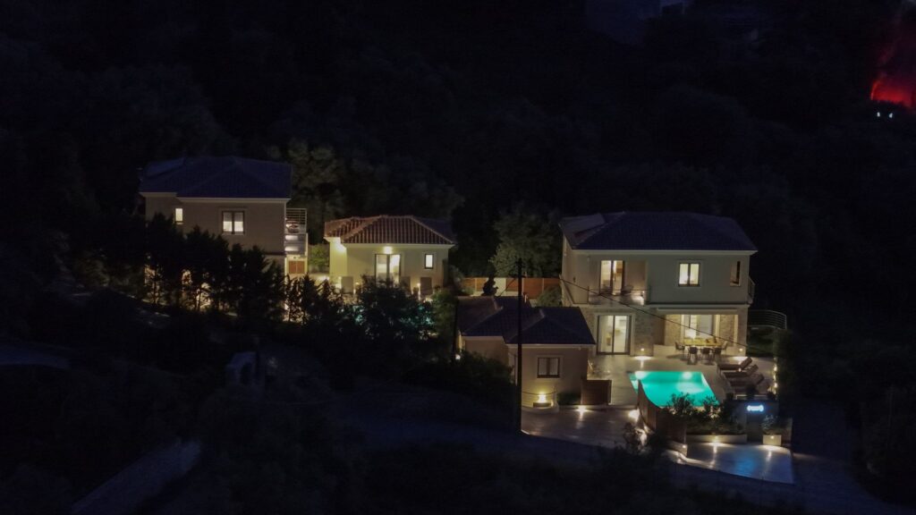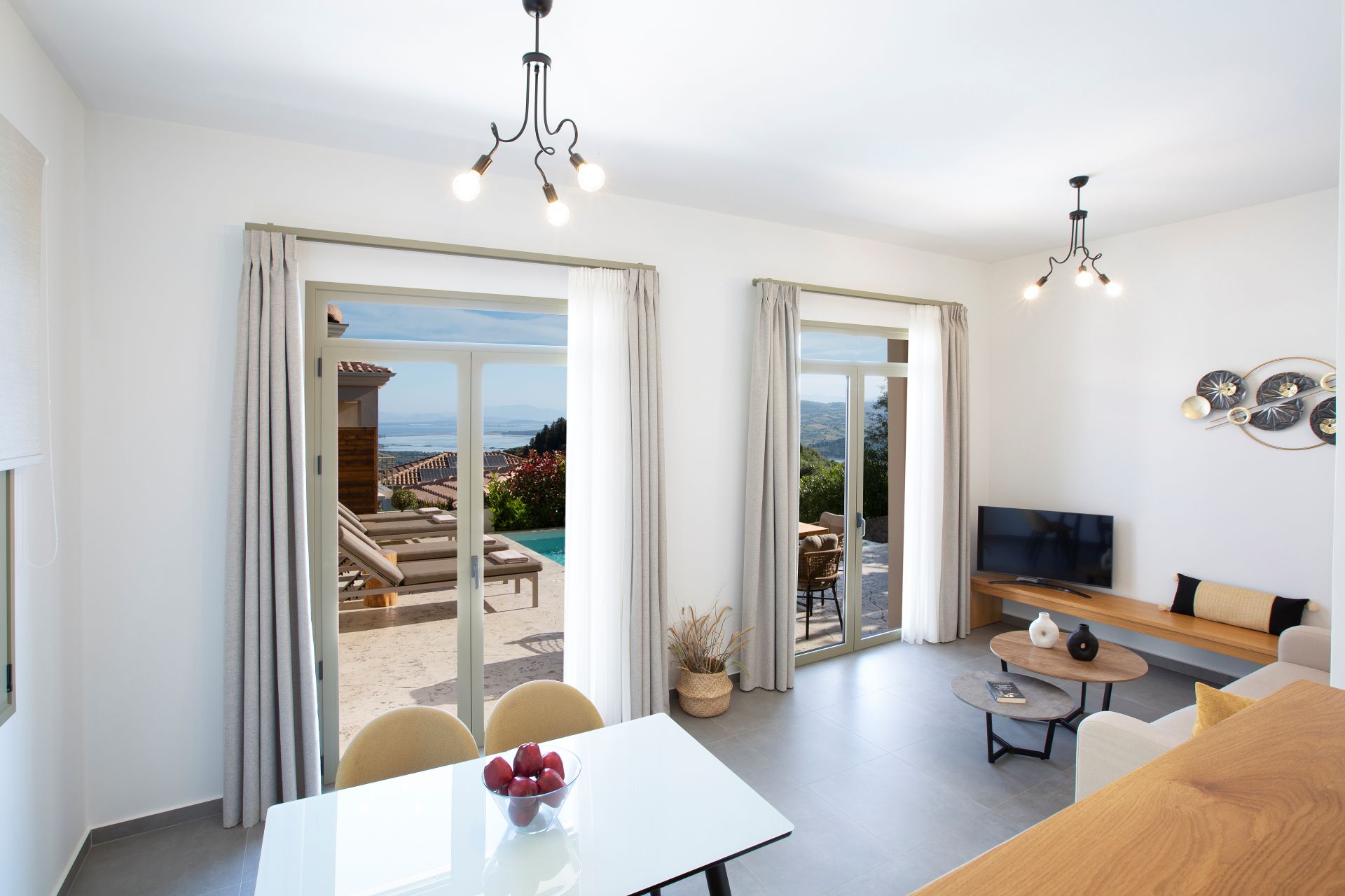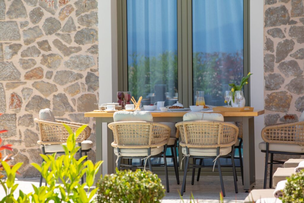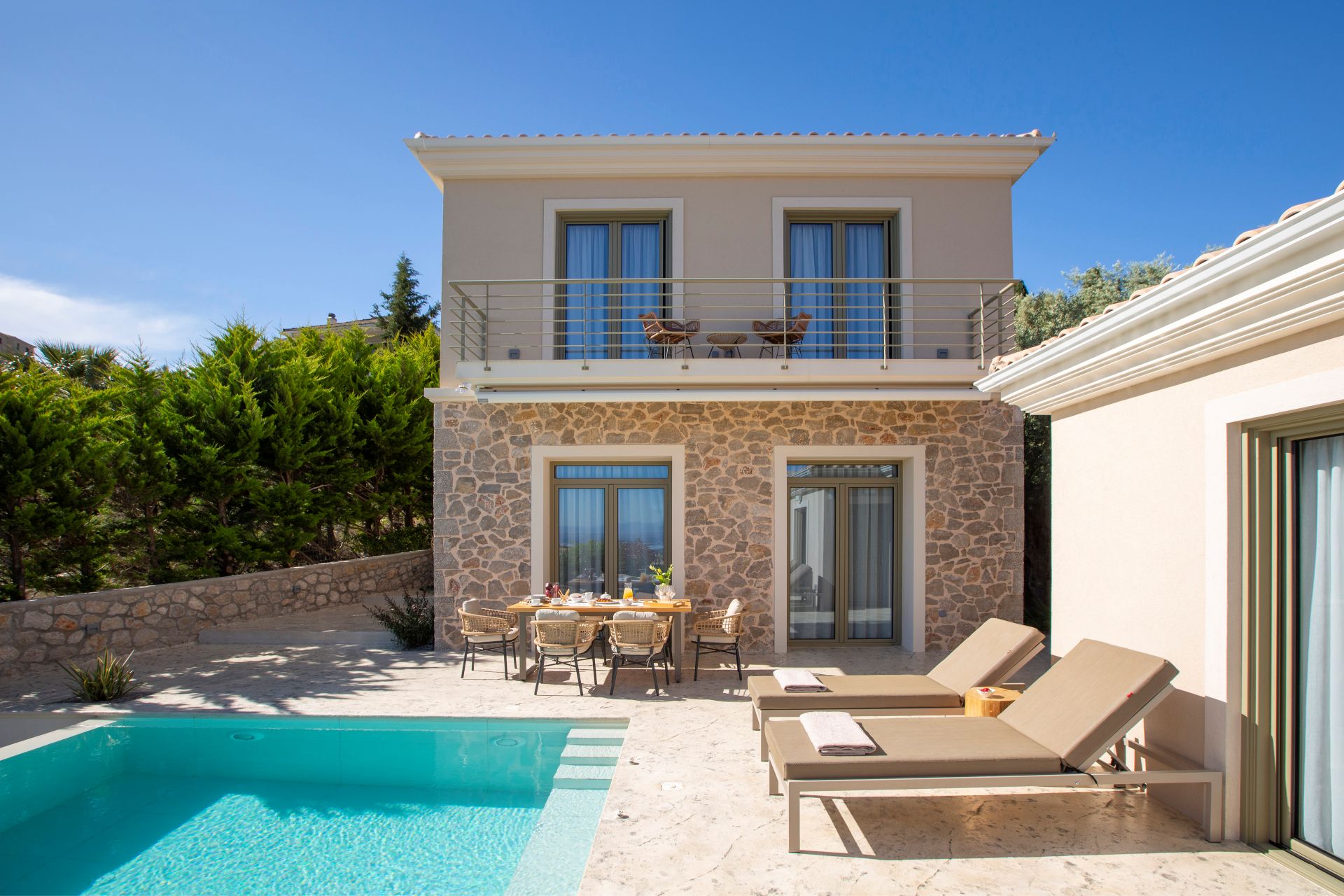 On the first building which is two floors there are 2 bedrooms a living room and a kitchen. On the first floor are 2 master bedrooms with en suite bathrooms with showers. The first bedroom has a double bed (160×200) a balcony with sea view, TV and A/C. The second bedroom has 2 single beds(90×200) that also can be combined to a big double bed (180×200) with a balcony with sea view and TV and A/C.