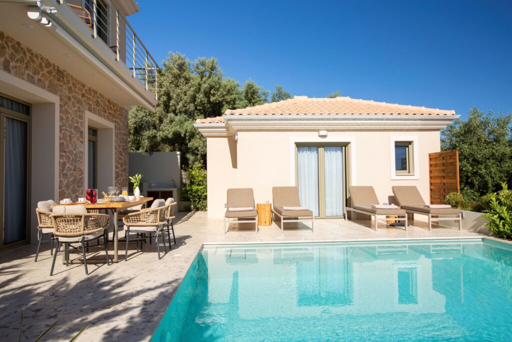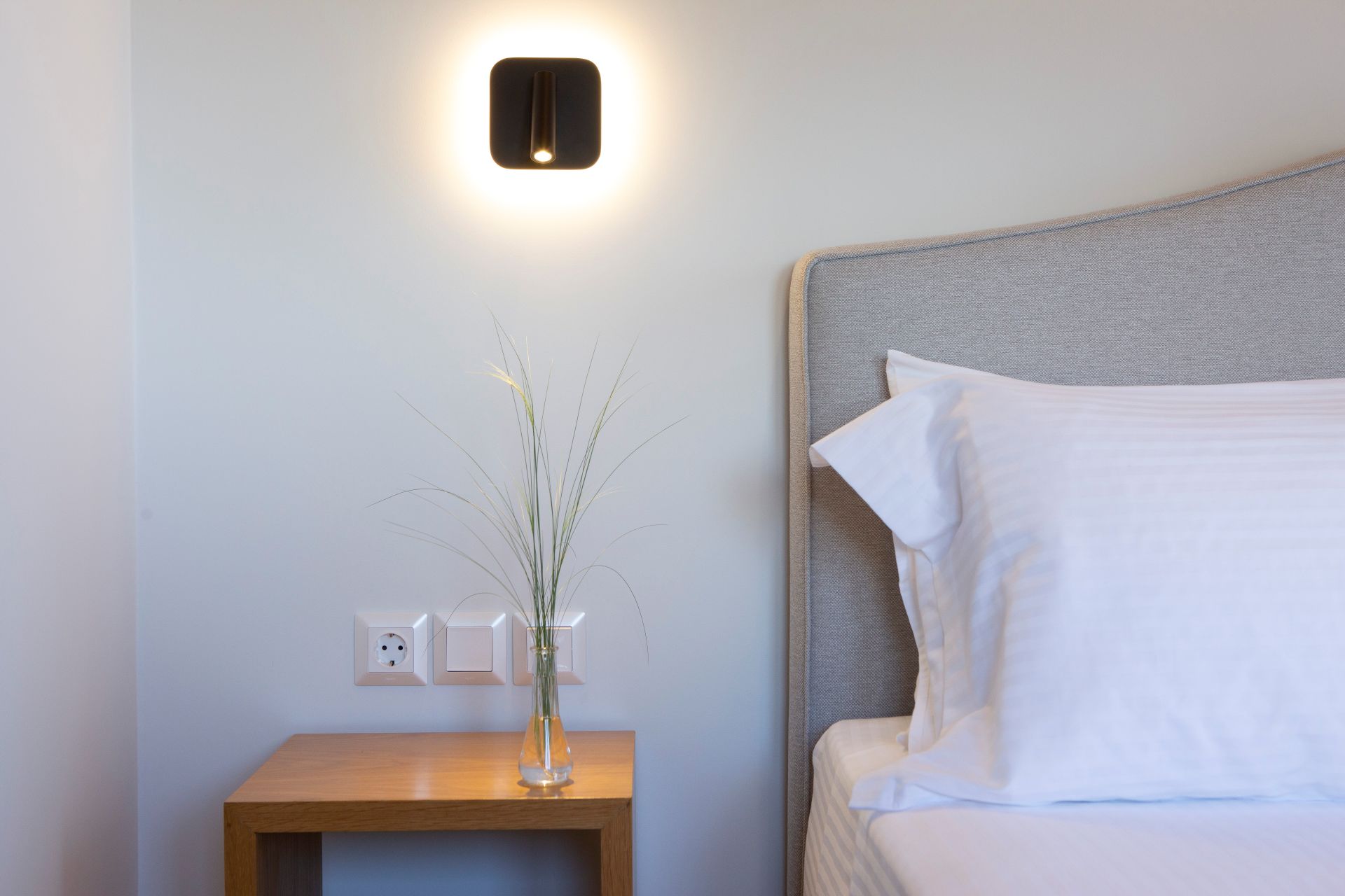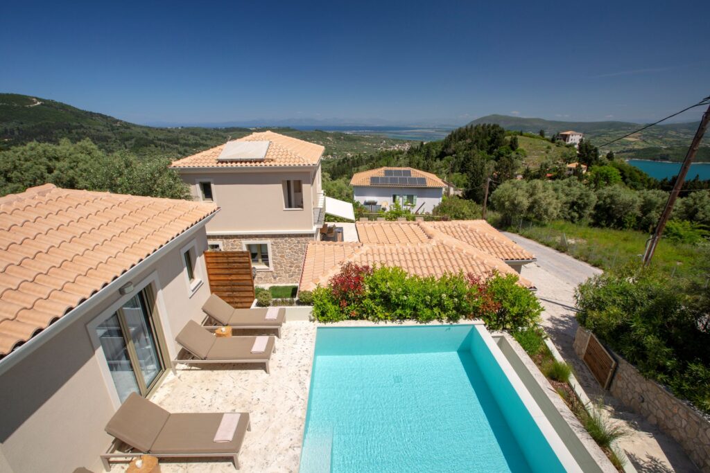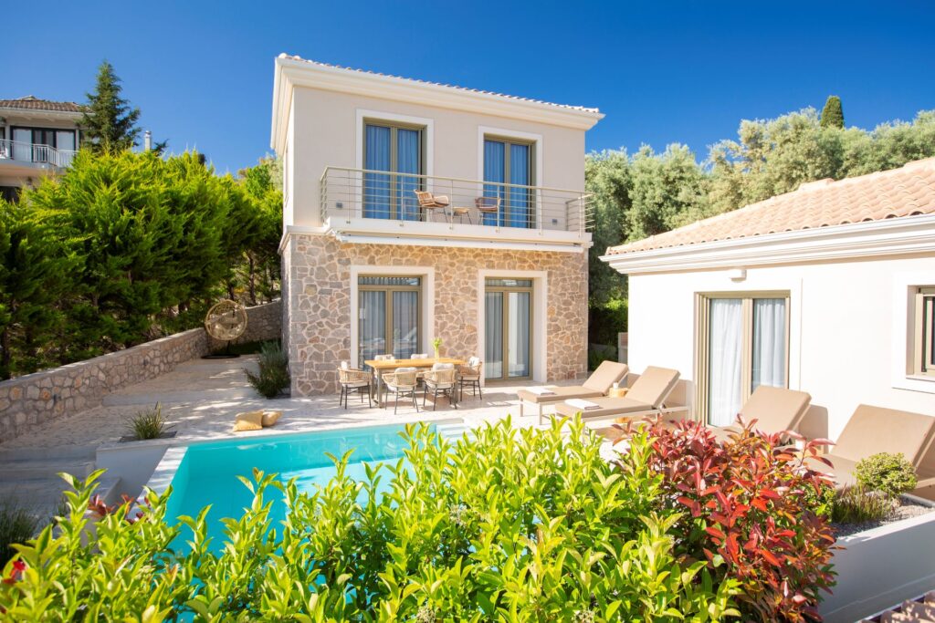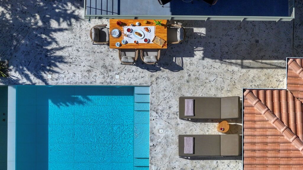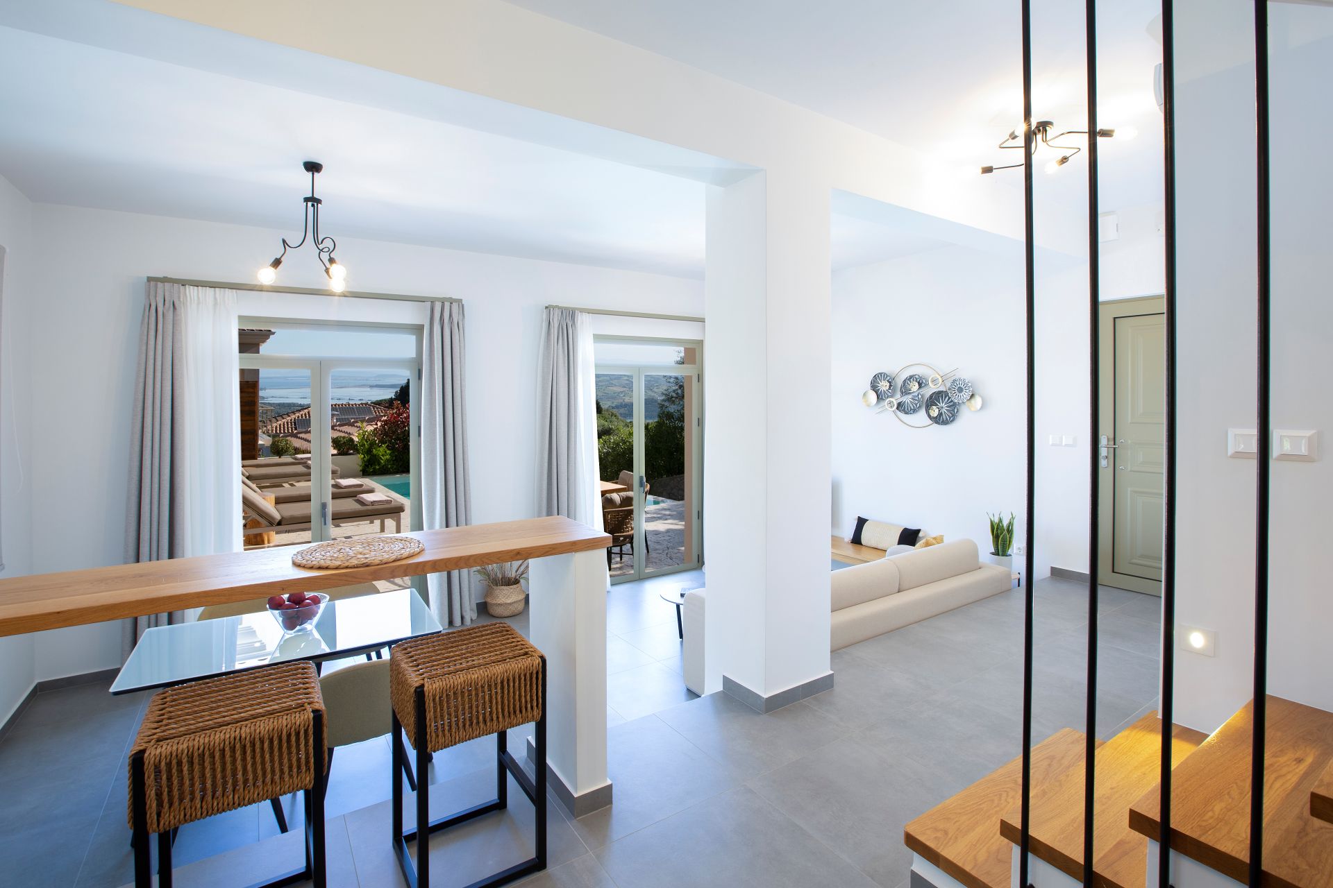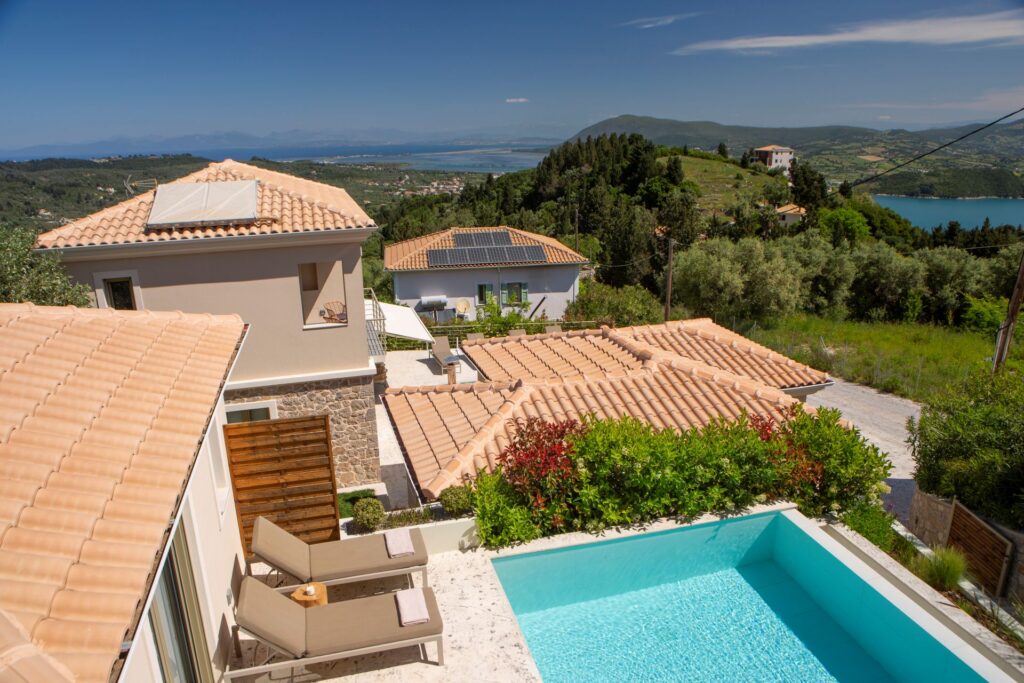 On the first building which is two floors there are 2 bedrooms a living room and a kitchen. On the first floor are 2 master bedrooms with en suite bathrooms with showers. The first bedroom has a double bed (160×200) a balcony with sea view, TV and A/C. The second bedroom has 2 single beds(90×200) that also can be combined to a big double bed (180×200) with a balcony with sea view and TV and A/C.
