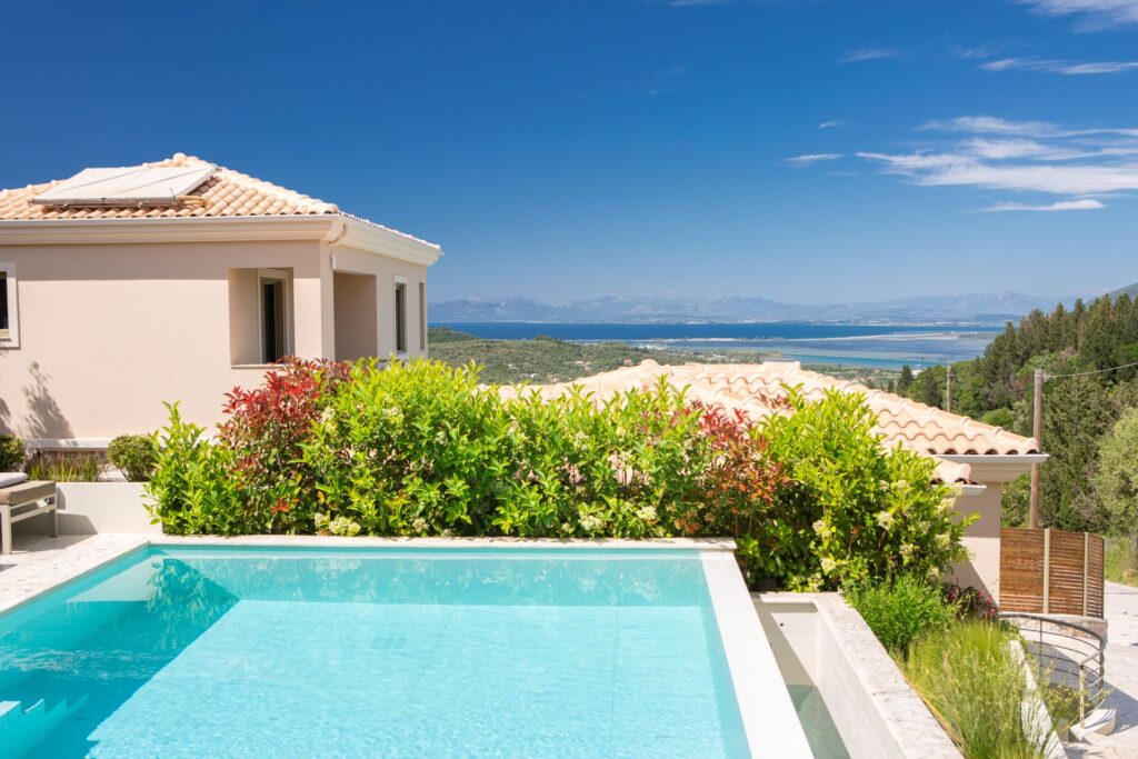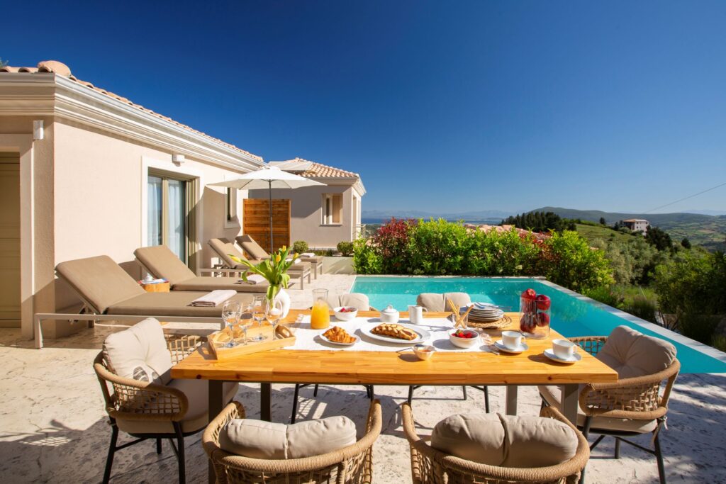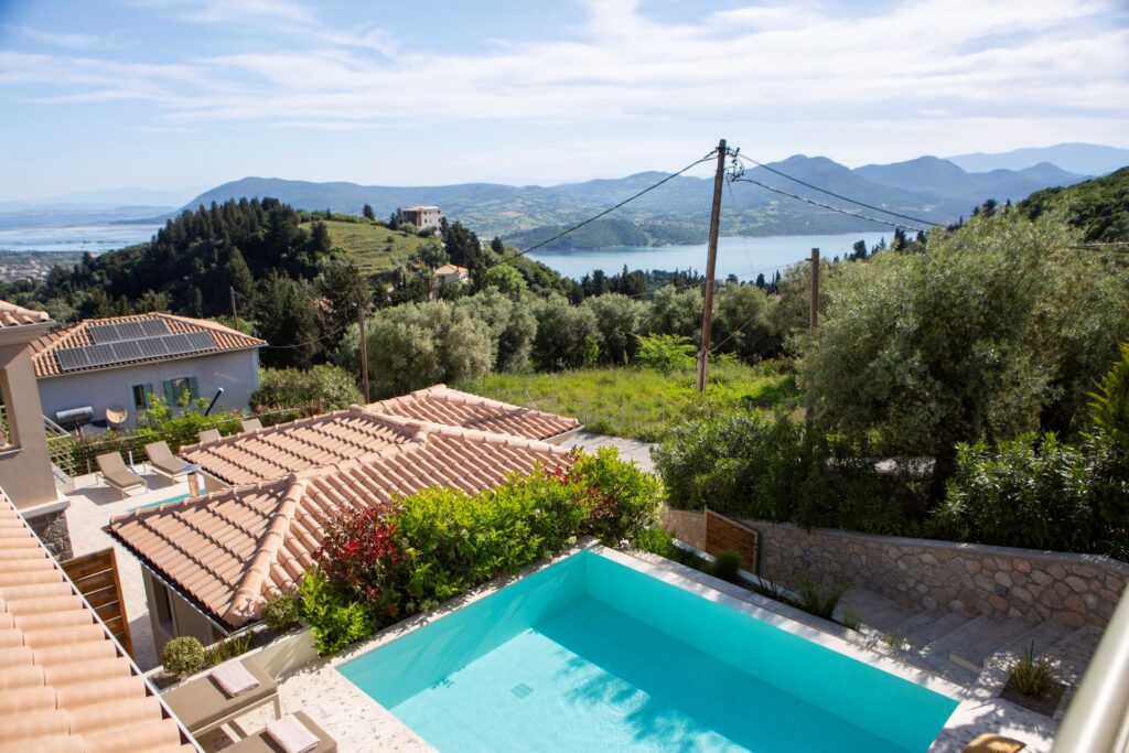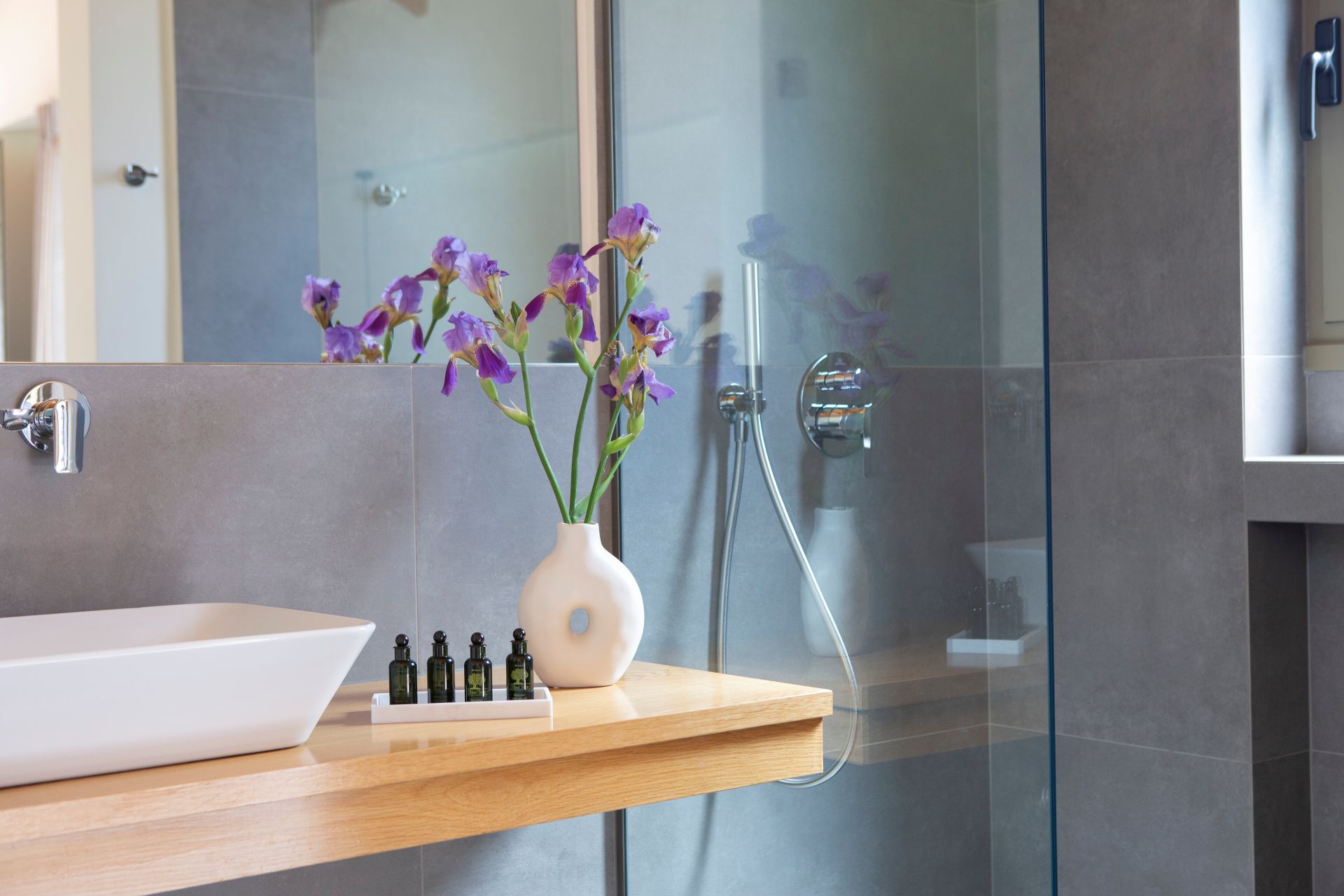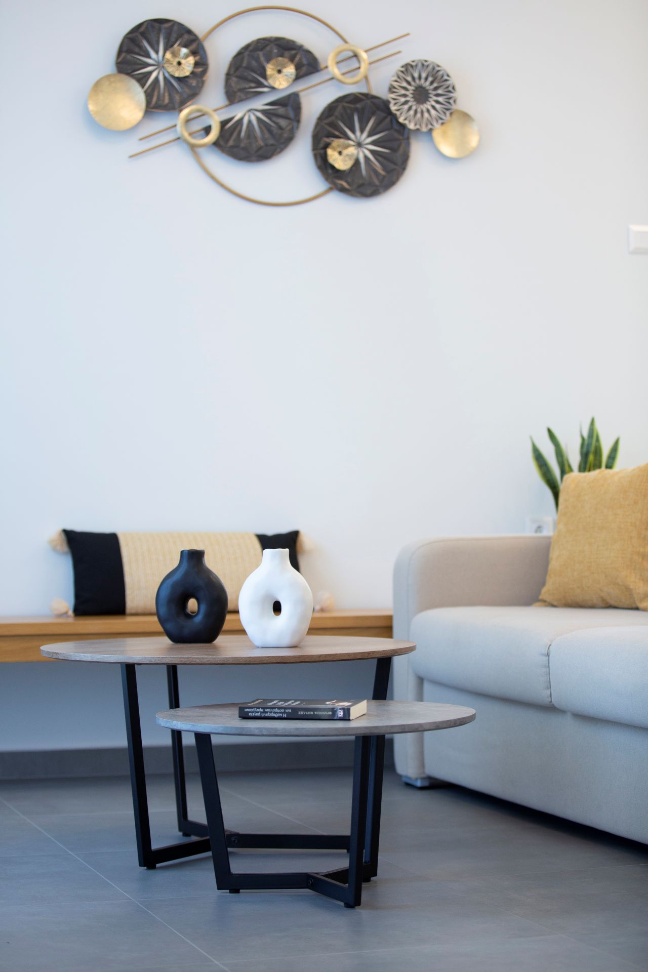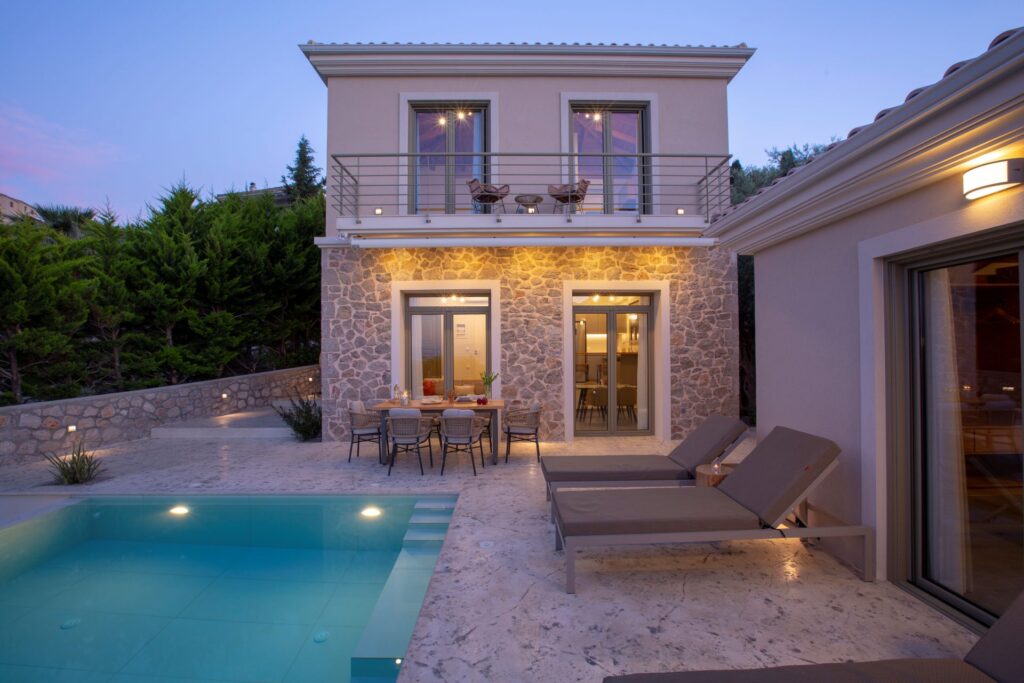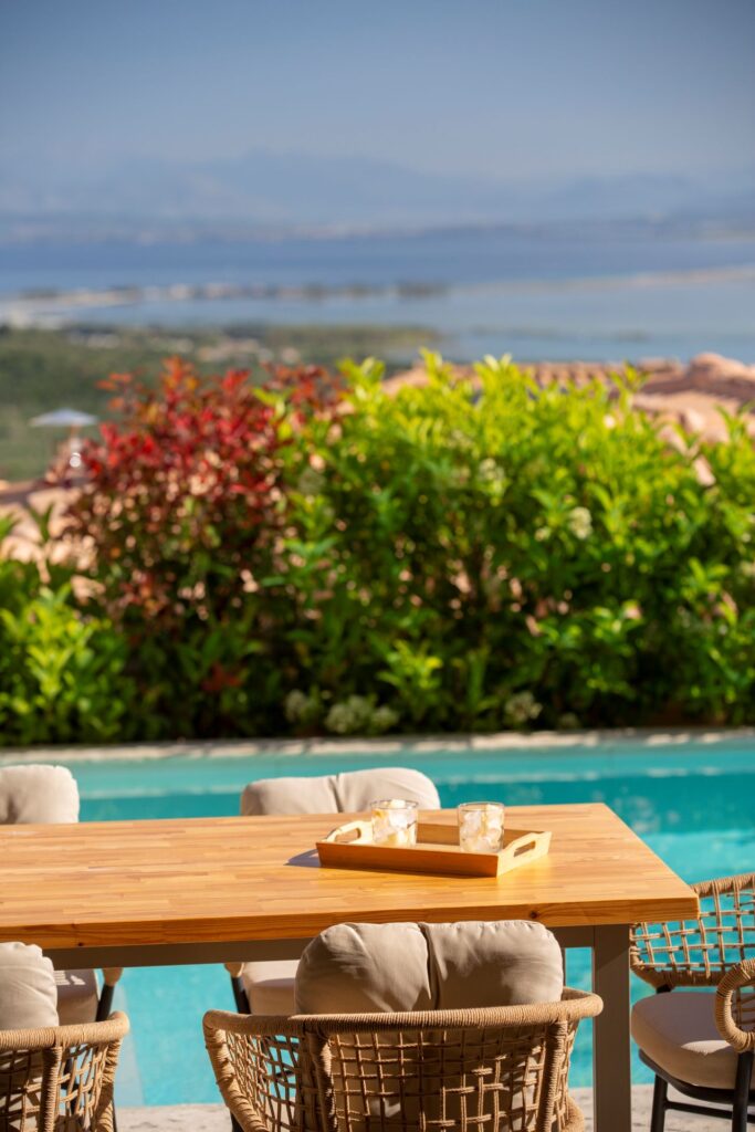 On the first building which is two floors there are 2 bedrooms a living room and a kitchen. On the first floor are 2 master bedrooms with en suite bathrooms with showers. The first bedroom has a double bed (160×200) a balcony with sea view, TV and A/C. The second bedroom has 2 single beds(90×200) that also can be combined to a big double bed (180×200) with a balcony with sea view and TV and A/C.