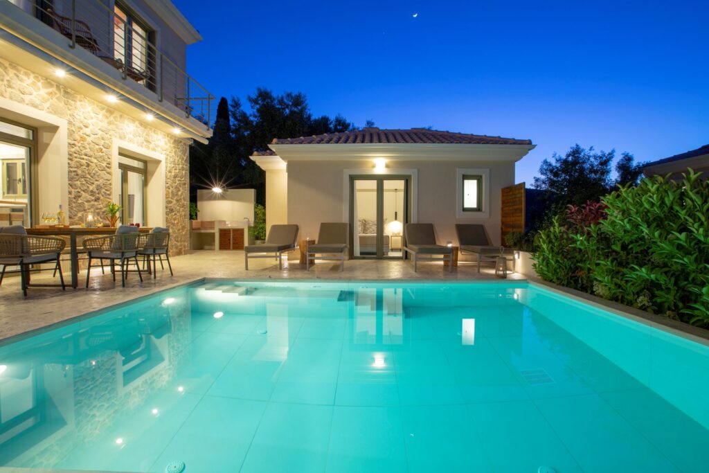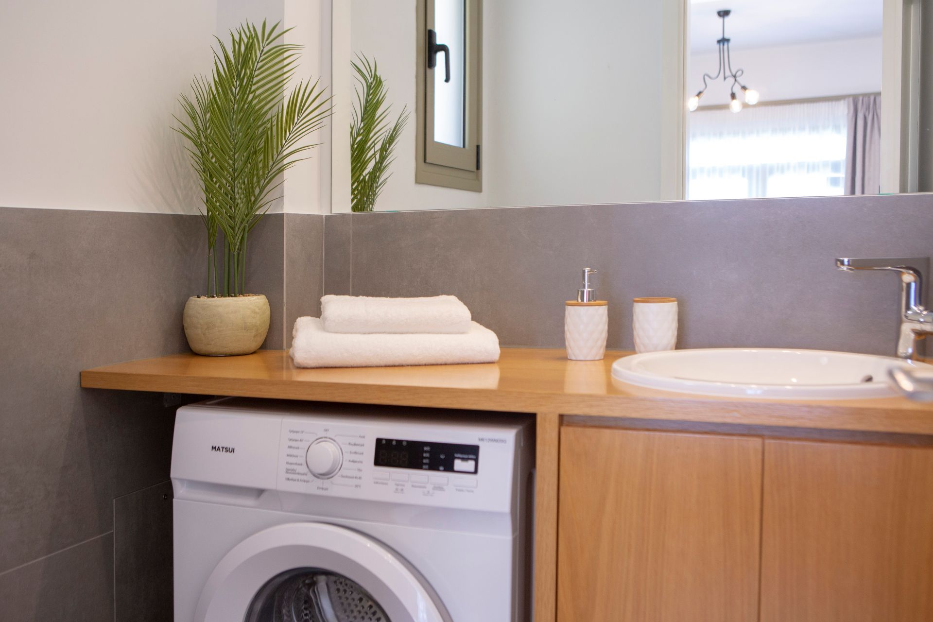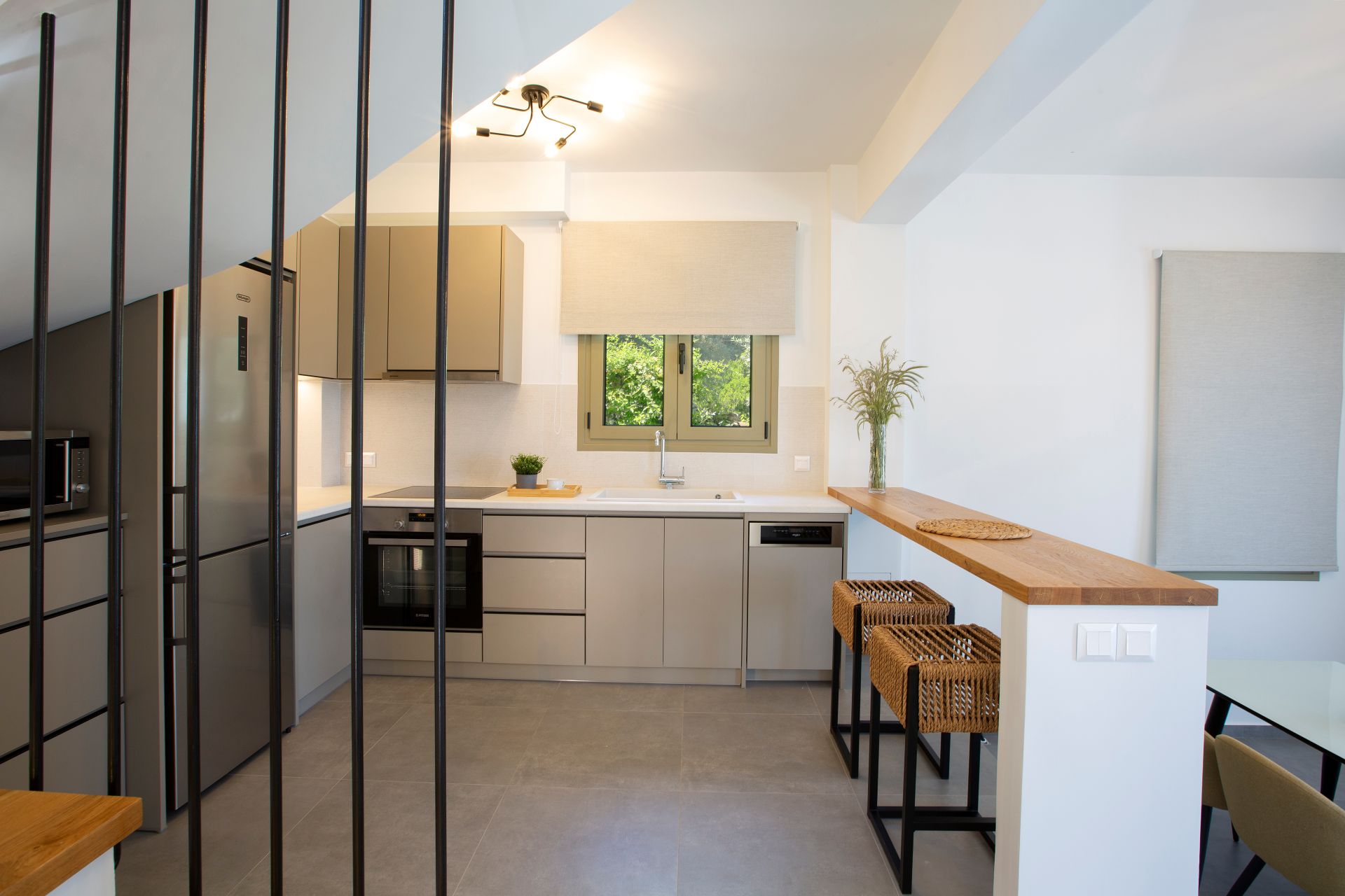 On the base floor of the first building it exist a fully equipped kitchen with all utensils in order to prepare your meals (oven, stove, kitchen, microwave, dishwasher, coffee machine maker, espresso machine, kettle, toaster, fridge), a big dining room. On the living room there is a big sofa couch that can accommodate up to 2 guests. It also has a WC. Also A/C, TV, washing machine.